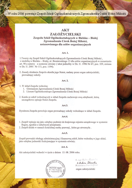 Zespół Szkół Ogólnokształcących Zgromadzenia Córek Bożej Miłości jest instytucją publiczną, prowadzoną przez Prowincję Polską Zgromadzenia Córek Bożej Miłości „Instytut Marii”. Wychowanie i kształcenie w Szkole Podstawowej i Liceum Ogólnokształcącym jest oparte na chrześcijańskim systemie wartości głoszonym przez Kościół Katolicki. Jezus Chrystus jest punktem odniesienia, najwyższym Autorytetem, inspiracją dla uczniów, nauczycieli, wychowawców, rodziców i pracowników szkoły.