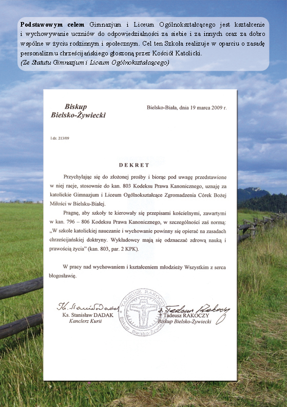 - wychowuje młodego człowieka w poszanowaniu prawdy, sprawiedliwości, uczciwości, pokory, wspólnego dobra, twórczego myślenia, akceptacji, zrozumienia, wiary i osobistej więzi z Bogiem.