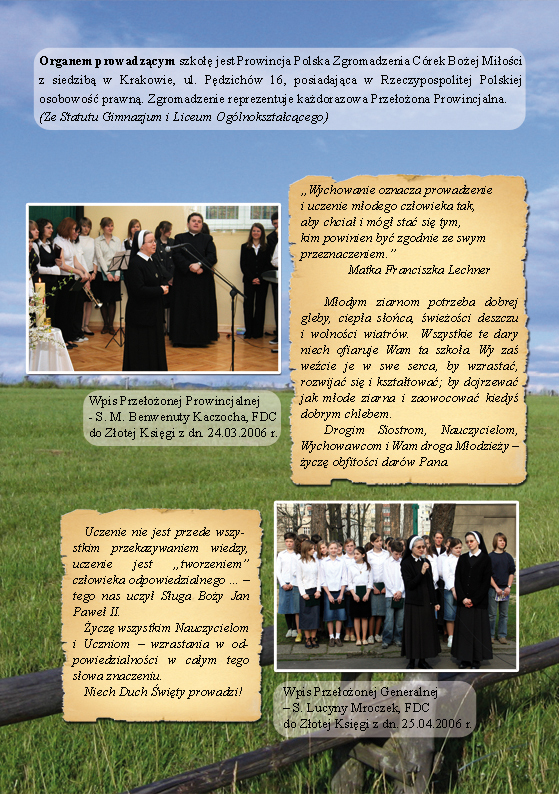 - zapewnia wychowankom wszechstronny rozwój intelektualno-duchowy w oparciu o chrześcijańskie wartości ogólnoludzkie i system wychowawczy M. F. Lechner,